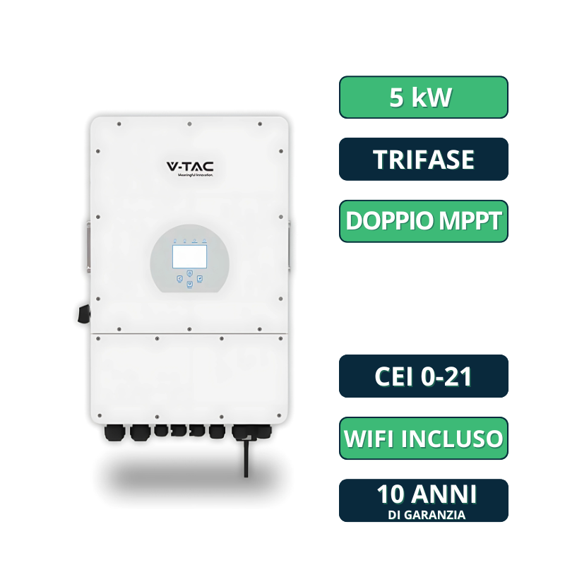 V-TAC INVERTER IBRIDO 5KW TRIFASE ON/OFF GRID IP65 CON DISPLAY LCD GARANZIA 10 ANNI CEI 0-21