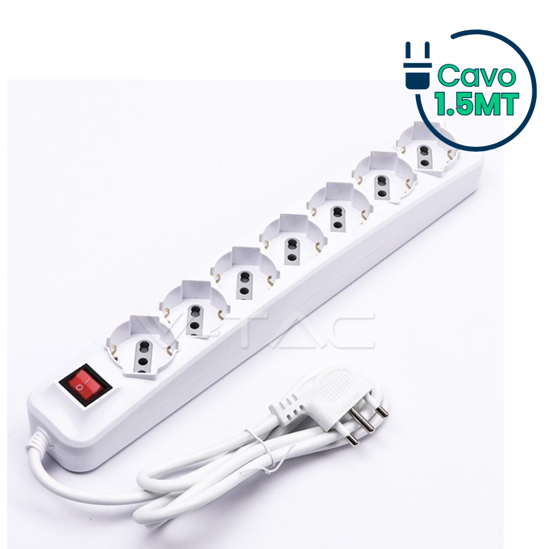 V-TAC MULTIPRESA CON 7 PRESE SCHUKO/BIPASSO SPINA 2P+T 16A CAVO 1.5 MT E INTERRUTTORE